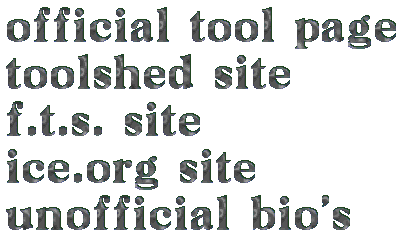 [tool logo pic] [copyright cyberwlf 1998] TOOL biographies unofficial tool web site flooding.the.senses tool web site the excellent toolshed tool web site the official tool band web site